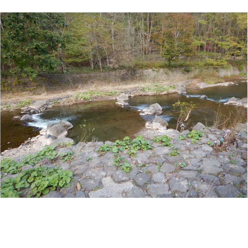 既設のコンクリート帯工の河床低下を空石積みにより元の河床を復元して、治水対策と魚類の生息環境を復元するための設計と施工指導を行いました。