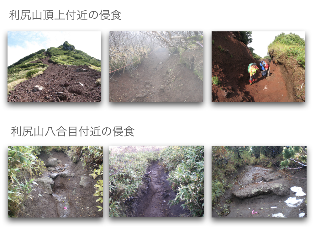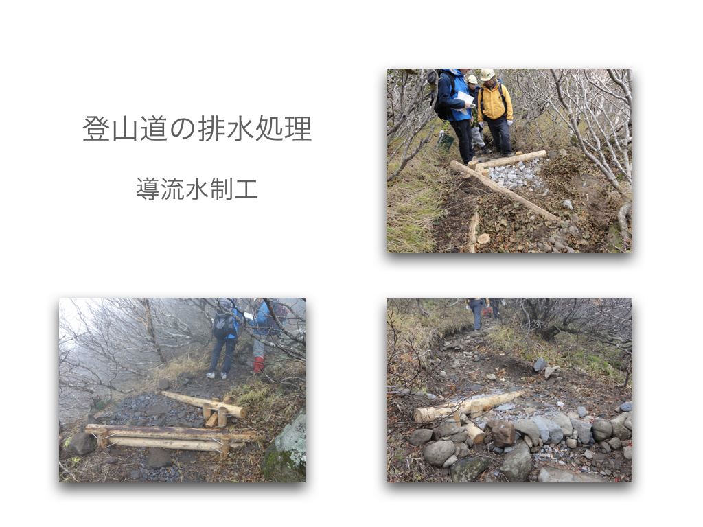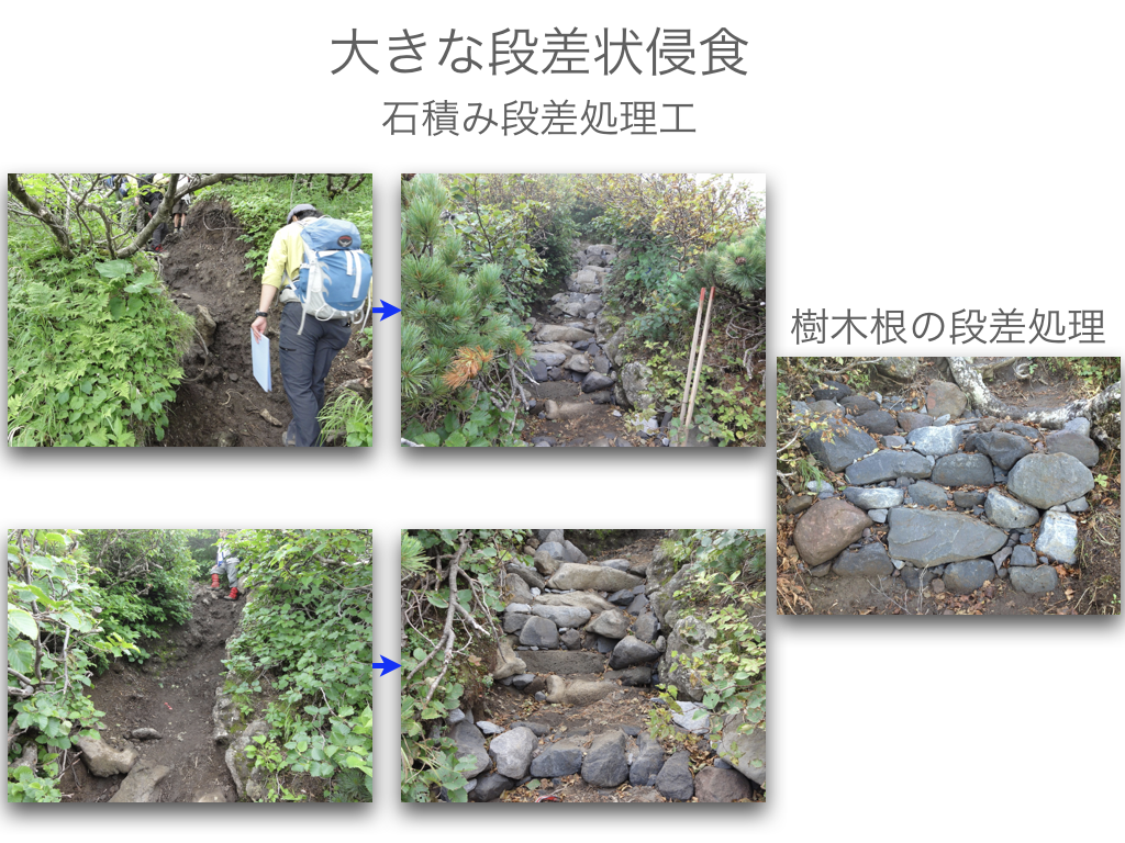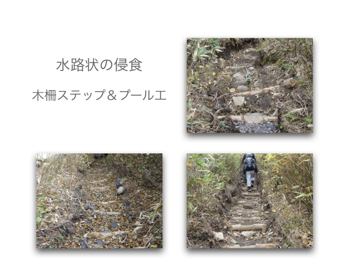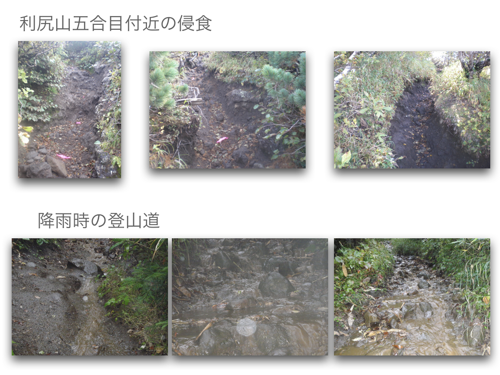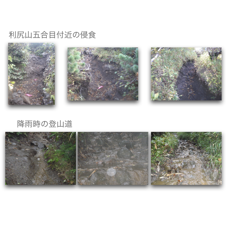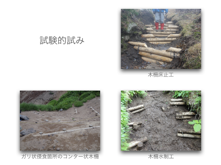 登山道整備 侵食が進む登山道の保全修復と利用者の安全確保のために 利尻山登山道の整備方針・荒廃が進む登山道と周辺の自然環境を保全復元する・安全に登山できる歩行路を確保する・利尻山の自然景観を守る 登山道の整備工法の検討 ・上部から下部の地形地質に馴染む工法 ・安定した渓流河川の構造を参考にする ・流水の侵食力を「蛇行」「ステップ」「プール」「水流の集中拡散」の連続で弱める(流水を力づくで抑えない) ・人工的なデザインを使わない(自然界のデザインは混沌) ・使用材料は極力現地のものを使う アルバムへ